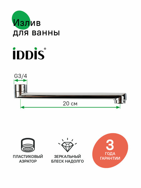 Короткий (20 см) излив IDDIS® предназначен для подачи поступающей из смесителя воды. С таким аксессуаром необходимость в дополнительной уборке сведена к минимуму – мощная и ровная струя не дает воде разбрызгиваться. Изменить направление воды и спрятать излив под корпус будет удобно благодаря поворотному механизму. Модель отличается своей износостойкостью и безопасностью даже при длительном контакте с водой благодаря прочному корпусу из нержавеющей стали. Плоский и короткий излив IDDIS® сэкономит полезное пространство и будет выглядеть эстетично в ванной комнате практически любого стиля и дизайна. Модель подходит для комплектации хромированных смесителей любых производителей. • Хромированное покрытие излива IDDIS® устойчиво к появлению царапин и потускнению (при должном уходе). На протяжении многих лет он будет выглядеть как новый. • Съемный пластиковый аэратор M24 гарантирует ровный и мягкий поток воды без брызг. Встроенный в аэратор ограничитель потока сокращает расход воды без ущерба комфорту. Расходы на коммунальные платежи снижаются. • Гарантия на аксессуары к смесителям IDDIS® – 3 года.