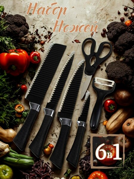 ✨ Что входит в набор? Большой нож – для нарезки мяса, овощей и крупных продуктов Ножи среднего и малого размера – для точной и аккуратной нарезки ✂ Кухонные ножницы – многофункциональные, идеально подходят для рыбы, курицы и зелени Керамическая овощечистка (peeler) – мягкая, но точная чистка овощей и фруктов Почему именно наш набор? ✅ Зубчатые лезвия — легко режут даже скользкие продукты ✅ Современная эргономичная ручка – удобно лежит в руке, не скользит ✅ Покрытые лезвия ножей – не ржавеют, долго остаются острыми ✅ Компактная и аккуратная упаковка – отличный выбор в качестве подарка
