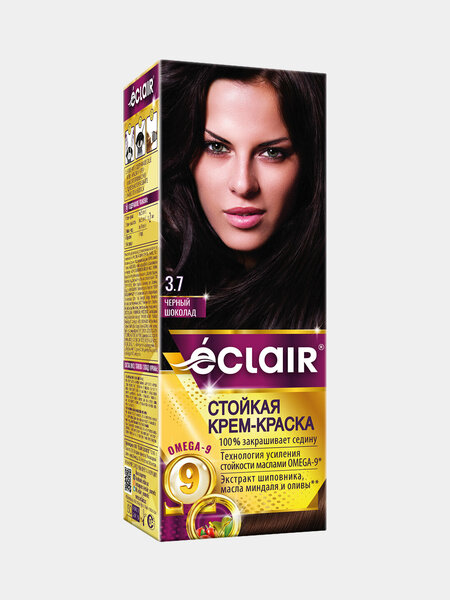 Крем-краска для волос "Чёрный Шоколад" Eclair Omega 9 - это стойкое и интенсивное окрашивание волос в стильный, яркий и восхитительный цвет. Благодаря технологии масла Omega-9, волосы окрашиваются глубоко и интенсивно, а результат окрашивания сохраняется на длительное время. Маска-уход для волос с миндальным маслом закрепляет результат окрашивания, увлажняет волосы и дарит им незабываемый блеск и аромат. Применение краски простое и удобное. Наденьте перчатки, выдавите содержимое пакетиков с крем-краской и крем-окислителем в неметаллическую миску, тщательно перемешайте и приступайте к окрашиванию. Нанесите смесь на сухие, немытые волосы, разделите их на равные пряди и прокрашивайте последовательно корни волос. Оставьте смесь на волосах на 40 минут, затем смойте и нанесите маску-уход после окрашивания. В комплект входят: 1) крем-краска 2 саше по 25 мл, 2) крем-окислитель 2 саше по 25 мл, 3) маска-уход 2 саше по 10 мл, 4) перчатки 1 пара и 5) инструкция. Вид окрашивания: стойкое. Закрашивание седины: да.