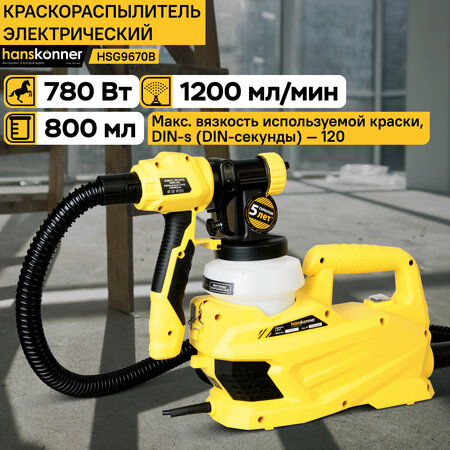 Электрический краскораспылитель Hanskonner HSG9670B — компактный и удобный электроинструмент для простого и быстрого окрашивания поверхностей лакокрасочными материалами различной вязкости, обработки антисептиком. В данной модели применяется технология HVLP (Большой Объем, Низкое Давление), что способствует повышению продуктивности и экономии наносимых растворов вследствие низких потерь на «туманообразование» и «отбоя» краски от поверхности, а также подсушиванию нанесенного слоя восходящим потоком воздуха. Разнесенные компрессор и распылитель обеспечивают минимальные вибрацию и вес, приходящиеся на руки оператора. Сменные сопла и возможность регулирования факела позволяют с полной отдачей окрасить поверхность любой конфигурации. К быстрой разборки и эффективной очистки располагает секционная конструкция краскораспылителя. Для удобной сборки и хранения шланга предусмотрено специальное крепление – StorageHook. Морозостойкий резиновый сетевой кабель длинной 4 м, позволяет охватит рабочую зону площадью 50 м2.