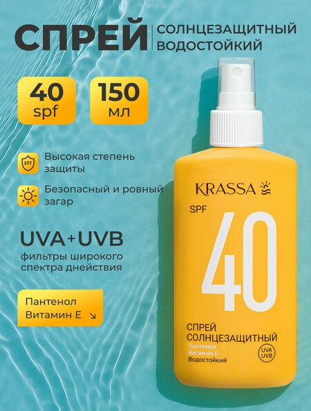 KRASSA Солнцезащитный спрей SPF 40, крем от загара с пантенолом, 150 мл
