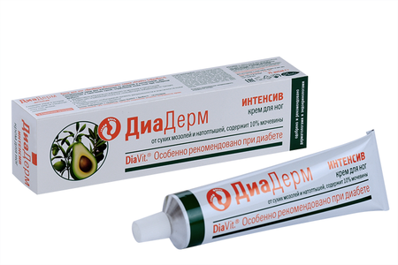 Крем ДиаДерм Интенсив отличается повышенным содержанием мочевины (10%), что обеспечивает эффективное и безопасное устранение сухих мозолей и «натоптышей». Активные компоненты - Комплекс молочной кислоты и мочевины размягчает огрубевшую кожу, устраняет сухие мозоли и участки утолщения кожи. Метаболический комплекс (витамины A, E, F) улучшает обменные процессы и процессы эпителизации. Влагоудерживающий компонент (мочевина) в комплексе с маслами (оливковое, авокадо, жожоба) интенсивно смягчает и обеспечивает необходимый уровень увлажненности кожи на длительное время.