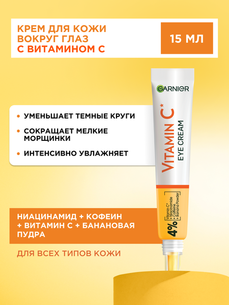Наш первый крем для кожи вокруг глаз от Garnier с высокой концентрацией 4% комплекса [ниацинамид+кофеин+витамин С + банановая пудра]. Он интенсивно увлажняет, заметно уменьшает темные круги под глазами и мелкие морщинки. Область вокруг глаз выглядит отдохнувшей.