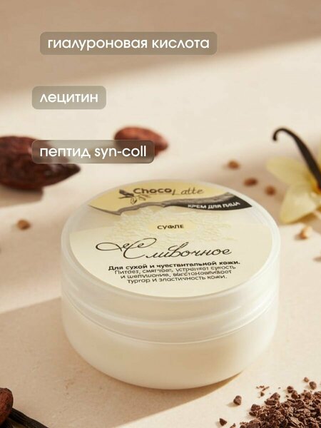 ChocoLatte Крем для лица Суфле Сливочное, 45 мл Крем для лица Суфле Сливочное от ChocoLatte — это нежный уход, созданный специально для молодой сухой и чувствительной кожи. Его текстура тает на коже, словно воздушное суфле, оставляя ощущение глубокого комфорта и уверенности в результате. Каждый день ваша кожа получает необходимое питание, сухость и шелушение уходят, а тугор и эластичность возвращаются естественным образом. Тонкий ванильно-сливочный аромат превращает ритуал ухода в настоящее наслаждение, не перегружая кожу. Этот крем идеально подходит для тех, кто ищет крем для лица для сухой кожи, который мягко устраняет дискомфорт от стянутости и покраснений. Он питает на клеточном уровне, восстанавливая защитный барьер, и защищает от внешних раздражителей. Для чувствительной кожи лица суфле сливочное становится настоящим спасением: успокаивает, смягчает и дарит ощущение гладкости без липкости или жирной пленки. Рекомендуется для возраста до 30 лет, когда кожа нуждается в легком, но эффективном питании. Крем для сухой чувствительной кожи Суфле Сливочное помогает справиться с шелушением после холодной погоды или сухого воздуха в помещении. Его формула с натуральными компонентами работает постепенно, укрепляя кожу изнутри. Используйте утром и вечером после очищения — небольшое количество средства равномерно распределяется по лицу, шее и декольте, быстро впитывается и готовит кожу к дальнейшему макияжу или отдыху. Результат заметен уже через неделю: кожа становится упругой, увлажненной и сияющей здоровьем. Для молодой кожи крем суфле сливочное ChocoLatte — выбор тех, кто ценит комфорт и естественность. Он не содержит агрессивных веществ, фокусируется на восстановлении и питании, делая кожу устойчивой к стрессам. Если вы ищете питательный крем для лица для чувствительной кожи, который борется с сухостью и шелушением, это средство подарит уверенность в своем отражении каждый день. Полный состав: вода, масло ши, масло жожоба, масло авокадо, цетеариловый спирт, глицерин, стеариновая кислота, пальмитиновая кислота, сорбитан стеарат, сукцинил амидин, полисорбат 60, феноксиэтанол, этилгексилглицерин, парфюм, токоферола ацетат, ретинил пальмитат, аскорбиновая кислота, экстракт алоэ вера, аллантоин, пантенол, гиалуроновая кислота. Способ применения: Нанесите небольшое количество крема на очищенную кожу лица, шеи и декольте легкими массажными движениями утром и вечером. Для усиления эффекта используйте после тоника или сыворотки. Храните в прохладном месте при температуре не выше 25°C. Объем: 45 мл.