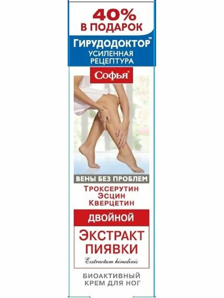 Крем для ног Софья с двойным экстрактом пиявки, троксерутином, эсцином и квертецином не только увлажняет кожу, но и помогает снизить отечность, повышенную утомляемость и болезненность в ногах. Экстракт медицинской пиявки способствует улучшению состава и уменьшению свертываемости крови, укреплению и восстанавлению внутренней поверхности проблемных вен, эсцин стимулирует микроциркуляцию и укрепляет стенки вен, а квертецин укрепляет стенки мелких капилляров и сосудов. Крем легко наносится и быстро впитывается. Подходит для ежедневного ухода за ногами. Объем 125 мл.