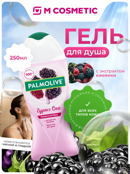 Крем-гель для душа Palmolive Гурмэ Спа Ежевичный Мусс: увлажнение и питание для всех типов кожи Крем-гель для душа Palmolive Гурмэ Спа Ежевичный Мусс объемом 250 мл обеспечивает эффективное очищение и увлажнение кожи. Подходит для всех типов кожи, включая сухую, чувствительную и комбинированную. Ягодный аромат с нотами ежевики, черной смородины и малины в сочетании с розой создает атмосферу релаксации и наслаждения после душа. Продукт протестирован дерматологами и не содержит парабенов, силиконов и спирта. Перерабатываемая упаковка и биоразлагаемость делают использование продукта более экологичным. Способ применения: нанести на влажную кожу, вспенить и смыть водой. Избегать контакта с глазами. При попадании в глаза тщательно промыть водой. Только для наружного применения. Выбирайте крем-гель для душа Palmolive Гурмэ Спа Ежевичный Мусс для качественного и комфортного ухода за кожей.