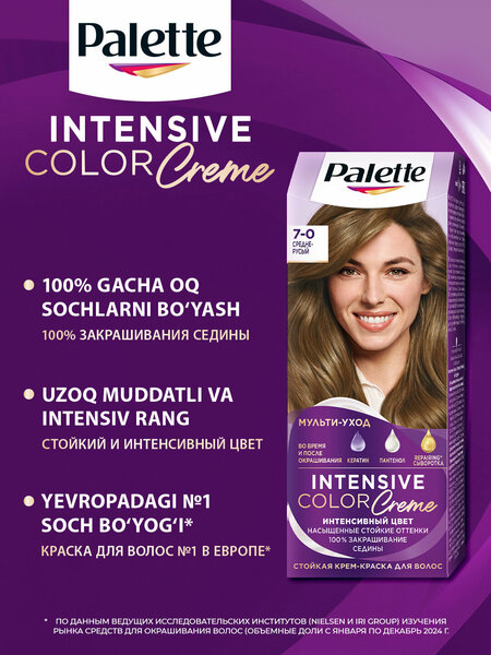 Стойкая крем-краска Palette Intensive Color Cream с формулой, содержащей высокоинтенсивные пигменты, проникает глубоко в структуру волос, защищая цвет от вымывания. Обеспечивает стойкий насыщенный цвет надолго и 100% закрашивание седины. Тройная система ухода с кератином, пантенолом и nutri-маслом в составе формулы и маски-ухода обеспечивает бережный уход за волосами, укрепляет и разглаживает волокна, наполняя их роскошным стойким оттенком.