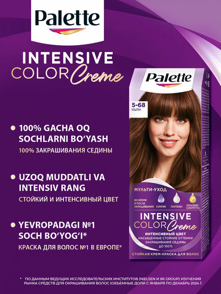 {"widgets":{"@card/VerifiedBadge":{"/content/page/fancyPage/defaultPage/verifiedBadge":{"wrapperProps":{"margins":{"bottom":"3"}},"badges":[{"style":"BG_INVERT_PRIMARY","text":"Оригинал","showChevron":false,"popupInfo":{"title":"Оригинал","items":[{"text":"Так отмечаются товары, по которым продавцы предоставили документы об оригинальности"}]},"zoneData":{"text":"Оригинал","type":"text"}}],"isUltimaKM":false,"footerButtonText":"Понятно"}}},"meta":{"/content/page/fancyPage/defaultPage/verifiedBadge":{"name":"@card/VerifiedBadge"}},"collections":{"offerAnalytics":{"4752858918838008430":{"showUid":"17711781984722732652206001","promoAttributes":[{"shopPromoId":"cf_bp_1000325","promoType":"unknown","promoKey":"qnMAt4qIJfIsmldjHOyQWg"},{"shopPromoId":"cf_135726","promoType":"empty-promo","promoKey":"xD1-78LDt8ve5lk-5jj0FQ"},{"shopPromoId":"L21272574","promoType":"empty-promo","promoKey":"MFWxXxdMnKIRFx9n7qfOGg","parentPromoId":""}],"wareId":"78vELJ6xAXx2KF2nPf0rmA","modelId":"1113847023","marketSku":"4334062248","paymentMethodTypes":["deliverycard","deliverycash","prepaymentcard"],"isCrossBorder":false,"isOnDemand":true,"isSponsored":false,"skuId":"4334062248","oskuId":"4334062248","marketSkuCreator":"market","price":20467,"oldPrice":29990,"merchPrice":29990,"vendorId":8524178,"hid":64248927,"nid":64249656,"isDigital":false,"deliveryPartnerTypes":["YANDEX_MARKET"],"offerColor":"blue","productId":1113847023,"feedId":51534820,"availableCount":11,"shopId":431782,"supplierId":198785541,"shopSku":"2914649","isExpress":false,"deliveryOptions":[{"partnerType":"market_delivery","dayFrom":1,"dayTo":1,"price":0}],"warehouseId":311,"isBnpl":true,"isInstallments":false,"businessId":"198785546","paymentTypes":["POSTPAYMENT","PREPAYMENT"],"benefit":{"type":"waremd5","isPrimary":true,"description":"Хорошая цена от надёжного магазина"},"yandexBnplInfo":{"enabled":true},"isBondAvailable":false,"allDeliveryOptions":[{"price":0,"partnerType":"market_delivery","dayFrom":1,"dayTo":1,"type":"DELIVERY"}],"isDSBS":false,"promos":[{"key":"qnMAt4qIJfIsmldjHOyQWg","type":"unknown","shopPromoId":"cf_bp_1000325","landingUrl":"https://market.yandex.ru/special/blocking-promo-landing?shopPromoId=cf_bp_1000325","isPersonal":false,"description":"Отключение магазинов по ID промо от ДЦО. Узбекистан"},{"key":"xD1-78LDt8ve5lk-5jj0FQ","type":"empty-promo","shopPromoId":"cf_135726","landingUrl":"https://market.yandex.ru/special/empty-promo-landing?shopPromoId=cf_135726","isPersonal":false,"description":"Новые_акции_для_лендингов_полок_УЗБ_Beauty_1201"},{"key":"MFWxXxdMnKIRFx9n7qfOGg","type":"empty-promo","shopPromoId":"L21272574","landingUrl":"https://market.yandex.ru/special/empty-promo-landing?shopPromoId=L21272574","isPersonal":false,"description":"Промокоды_для_Колесо_UZ_январь_Henkel_20%_198785541_2701"}],"prices":{"price":{"value":20467,"currency":"UZS"},"priceWithoutVat":{"value":18274,"currency":"UZS"},"discountedPrice":{"price":{"value":20467,"currency":"UZS"},"discount":{"value":9523,"currency":"UZS"},"percent":32}},"supplierType":"3","pp":200,"gci":"4334062248","title":"Palette Intensive Color 5-68 Каштан, стойкая крем-краска, интенсивный цвет,100% закрашивание седины, мульти-уход, 110 мл"}},"vendorDoc":{"4752858918838008430":{"verified":true}},"badges":{"4752858918838008430":{"gallery":["bi_8266655855392218655"],"train":[]}},"badgeItem":{"bi_8266655855392218655":{"style":"BADGE_PROPERTY_PRIMARY","type":"text","text":"ОРИГИНАЛ","popupInfoId":"pp_3667891250342019889","showChevron":true,"analytics":{"type":"originalBadge","text":"ОРИГИНАЛ","position":0}}},"popupInfo":{"pp_18064787403457921207":{"type":"onClickSignal","params":{"title":"С доставкой по клику удобнее","items":[{"label":"Привезём на мини-склад","text":"И сразу пришлём смс","icon":"cargo"},{"label":"Вызовите курьера","text":"В течение 3 дней","icon":"click"},{"label":"Можете добавить продукты","text":"Без доплаты за доставку","icon":"cart"},{"label":"Доставим всё за 15–30 мин","text":"Прямо до двери","icon":"flash"}],"actions":[{"text":"Понятно","type":"close","theme":"normal"}]}},"pp_3667891250342019889":{"params":{"title":"Оригинал","items":[{"text":"Так мы отмечаем товары популярных брендов, если продавец предоставил документы об оригинальности"}]}},"pp_15773598120700656811":{"type":"priceDetails","params":{"priceDetails":{"title":"Palette Intensive Color 5-68 Каштан, стойкая крем-краска, интенсивный цвет,100% закрашивание седины, мульти-уход, 110 мл","prices":[{"value":{"content":[{"type":"price","value":"20467.000000","unit":"сум"}],"feature":"RED_PRICE"},"subtitle":{"content":[{"type":"literal","value":"цена на товар"}],"feature":"SECONDARY_RED"}}],"discountDetails":[{"label":{"content":[{"type":"literal","value":"Обычная цена"}],"feature":"DETAIL_LABEL"},"value":{"content":[{"type":"price","value":"29990.000000","unit":"сум"}],"feature":"DETAIL_VALUE_CROSSED"}},{"label":{"content":[{"type":"literal","value":"Скидка "},{"type":"price","value":"32","unit":"%"}],"feature":"DETAIL_LABEL"},"value":{"content":[{"type":"price","value":"-9523","unit":"сум"}],"feature":"DETAIL_VALUE"}}]},"title":"Детали цены","actions":[{"text":"Понятно","type":"close","theme":"action"}]}}},"i18n":{"translations":{"common.buttons:add":"Добавить","common.buttons:add-data":"Добавить дан
