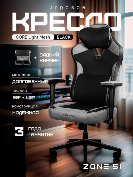 Кресло компьютерное ZONE 51 CORE Light Mesh Black (ThunderX3 Collaboration) - это игровое кресло, созданное для комфорта и удобства во время длительных игровых сессий. Оно выполнено из премиальных материалов, обеспечивающих долговечность и комфорт. Экокожа и плотная ткань придают креслу красивый внешний вид, а воздухопроницаемый материал набивки сохраняет прохладу в течение всего дня. Кресло оснащено задним карманом для хранения джойстика, пачки чипсов или запасной гарнитуры. Благодаря этому, вам не придется отвлекаться от игры. Мягкие подлокотники обеспечивают полный комфорт, а возможность настроить их высоту и угол гарантирует удобство во время игры. Мягкие подушки преумножат комфорт, а специальная подушка обеспечит полное удобство и снизит риск боли в спине и дискомфорта. Уникальная подушка с эффектом памяти обеспечивает полную поддержку шеи, а прочный эластичный ремень фиксирует подголовник в нужном положении. Материал подушки подстраивается под индивидуальные особенности, снижая нагрузку на шею и обеспечивая максимальный релакс. Благодаря синхронному наклону, вы можете откинуться назад и вытянуть ноги. Функция асинхронного наклона позволяет креслу плавно подстраиваться под ваши движения. Многофункциональный механизм SYNC4 позволяет настроить кресло оптимальным образом, регулируя высоту, спинку и блок контроля. Стальная пятиконечная крестовина обеспечивает исключительную прочность конструкции и устойчивость кресла, способную выдержать даже самые бурные празднования побед. Полиуретановые колесики не оставляют следов на напольном покрытии и обеспечивают плавное и бесшумное перемещение. Обращаем Ваше внимание! В новой партии дизайн нижней крестовины изменен заводом-изготовителем!