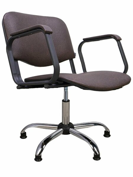 Парикмахерское кресло Контакт тёмно-коричневого цвета на пневмотическом подъемнике (Производство-Россия). Подлокотники: металлические с накладками из кож. зама. Регулировка по высоте: пневматический хромированный подъемник. Основание: хромированное пятилучье на резиновых подпятниках. Мягкие элементы изделия обиты искусственной кожей и изготовлены из высококачественного поролона. Высота сиденья (от), мм 410 Высота сиденья (до), мм 540