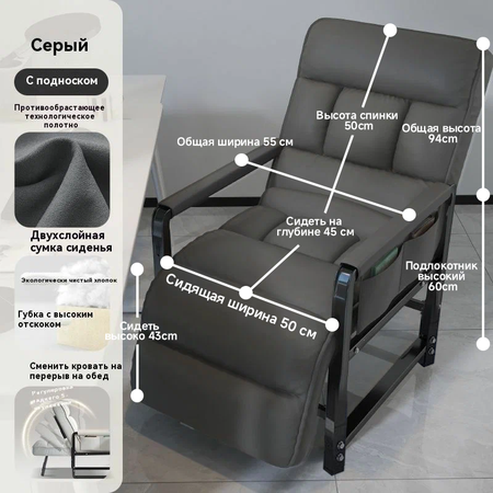 Описание товара Максимальный комфорт и удобство для вашего дома! Это многофункциональное кресло сочетает в себе комфорт, практичность и стиль. Регулируемые спинка и подставка для ног позволяют легко превратить его в кровать для отдыха, а боковой карман обеспечивает удобное хранение мелочей. Идеально подходит для гостиной или спальни. Основные преимущества: ✅ Многофункциональность: Регулируемые спинка и подставка для ног. ✅ Карман для хранения: Удобное место для книг, пульта или телефона. ✅ Комфортные материалы: Мягкий наполнитель и дышащая ткань. ✅ Прочная конструкция: Металлический каркас и антискользящие ножки. Почему стоит купить? Простое управление: Спинка и подставка для ног регулируются одним движением. Экономия пространства: Компактный дизайн подходит для небольших помещений. Красивые продуктыКрасивые продукты
