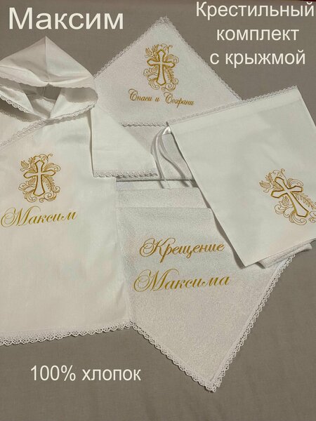 Набор для крещения включает в себя одежду, выполненную из 100% хлопка, что обеспечивает комфорт и безопасность для нежной кожи младенца. Основной элемент набора — крыжма, изготовленная из высококачественной бязи и махрового полотна. Эти материалы известны своей прочностью и мягкостью, что делает их идеальными для использования в церемониях крещения. Крыжма украшена изысканной вышивкой золотой нитью, что придаёт изделию особую торжественность и элегантность. Золотая вышивка гармонично сочетается с кружевом, добавляя изделию утончённости и изящества. Такое украшение не только подчёркивает значимость события, но и делает набор уникальным и запоминающимся. Махровое полотно, используемое в крыжме, обладает отличными впитывающими свойствами, что обеспечивает комфорт и удобство в использовании. Бязь, в свою очередь, известна своей воздухопроницаемостью и гипоаллергенностью, что особенно важно для детской одежды. Этот набор для крещения станет неотъемлемой частью важного события в жизни вашего ребёнка, обеспечивая ему комфорт и уют. Высокое качество материалов и изысканный дизайн делают его идеальным выбором для тех, кто ценит стиль и практичность. Набор с крыжмой — это не просто одежда для крещения, а символ заботы и любви, который останется в памяти на долгие годы.