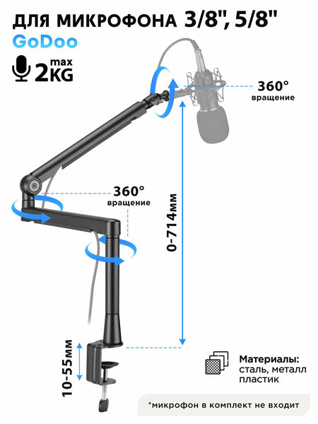 Профессиональная студийная микрофонная стойка GD13-2 с поддержкой крепления резьбы: 3/8" и 5/8" и максимальной нагрузкой 2кг. Кронштейн для микрофона изготовлен с использованием передового дизайна и качественных материалов, что обеспечивает плавную и легкую регулировку и позиционирование гаджета. Пантограф для микрофона содержит в комплекте универсальный адаптер крепления. Полностью алюминиевая конструкция легкая, но при этом достаточно прочная и долговечная. В комплект поставки входят крепления с зажимами для универсальных вариантов монтажа, мягкие накладки помогут избежать царапин на поверхности, а также предотвратить влияние звуковой вибрации на записи и прямые трансляции. Резьбовой держатель микрофона: подходит для большинства вокальных и динамических микрофонов. Стойка для микрофона настольная сделана из стали, пластика, алюминия. Длина стрелы: 719 мм. Диапазон высоты 0-714 мм. Наклон: от +90 до -60. Вращение: 360/180. 2 типа установки: в стол и на струбцину. Размеры 60x377~769x46~819 мм. Подставка для микрофона имеет встроенные кабельные зажимы, они позволят спрятать и зафиксировать провода для удобства и эстетичного вида. Складная конструкция на занимает много места на столе, не перегораживает обзор, высвободит полезное пространство на столе. Штатив для микрофона настольный отлично подойдет для музыкантов, летсплейщиков, стримеров, ютуберов, видеоблогеров, любителей караоке и компьютерных игр. Держатель для микрофона идеально подходит для студий и мультимедийных станций. Наша стойка для микрофона - выбор для людей, которые хотят создать эргономичное и удобное пространство для работы или отдыха.