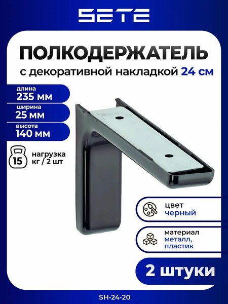 Полкодержатель SETE SH-24-20 — надёжная опора для полок с декоративной накладкой 24 см. Идеально подходит для шкафов, витрин и гардеробных. Изготовлен из прочного металла с хромированным покрытием и пластиковыми накладками — сочетает функциональность, долговечность и стильный внешний вид. Лаконичный дизайн органично вписывается в интерьеры лофт, минимализм, скандинавский или современная классика. Рассчитан на парное использование: два кронштейна выдерживают до 15 кг — подойдут для книг, посуды, декора и других предметов среднего веса. Габариты — длина 235 мм, высота 140 мм, ширина 25 мм — обеспечивают устойчивую опору без чрезмерного выступа. Выпуклая форма надёжно фиксирует полку, исключая соскальзывание, а накладной монтаж — прост и быстр. Доступен в четырёх цветах: хром, бежевый, коричневый и чёрный. В линейке также есть модели с накладками 12 и 18 см — подберите под толщину вашей полки. Вес одного держателя — всего 0,55 кг. Производство: Китай. Продаётся комплектом из 2 шт. — достаточно для одной полки. SETE SH-24-20 — практичный, долговечный и эстетичный выбор для современной и функциональной мебели.