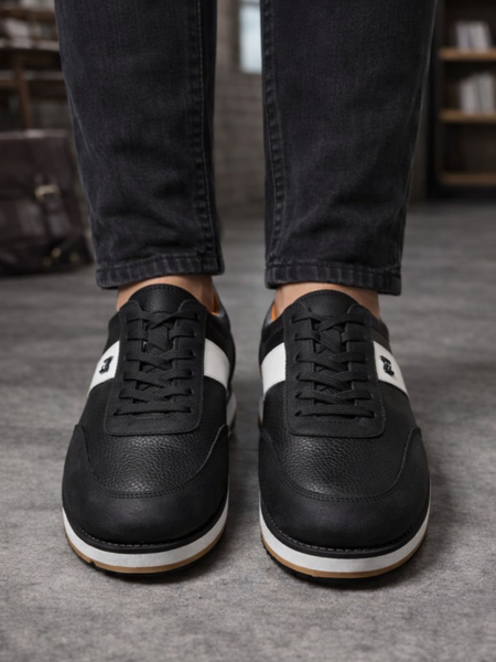 Стильные мужские кроссовки из натуральной кожи. Универсальная модель для повседневной и полу-классической одежды. Модель выполнена из высококачественной натуральной зернистой кожи. Материал устойчив к износу, сохраняет форму и внешний вид даже при активной эксплуатации. Внутренняя подкладка мягкая и дышащая, что обеспечивает комфорт на протяжении всего дня. Шнуровка надёжно фиксирует стопу. Подошва многослойная, с амортизацией и противоскользящей поверхностью. Чёрный цвет делает модель универсальной — идеально сочетается с джинсами, брюками и одеждой в стиле casual и smart casual. Преимущества: Натуральная кожа Дышащая подкладка Амортизирующая подошва Противоскользящая основа Качественная прошивка Удобная посадка Универсальный цвет Характеристики: Тип: Мужские кроссовки Материал: Натуральная кожа Подкладка: Мягкая Подошва: Амортизирующая Цвет: Чёрный Стиль: Casual / Smart casual Сезон: Весна, осень, зима Тип застёжки: Шнуровка