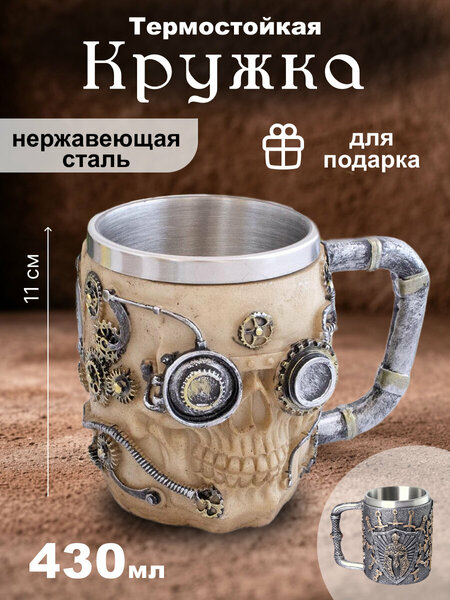 Подарочная сувенирная кружка с изображением черепа в цвете под кость. Сама кружка изготовлена из нержавеющей стали, с внешней стороны покрыта тематическим рельефным изображением из полистоуна. Кружка Чере - интересный и оригинальный подарок для мужчины. Размер кружки - 15х10,5х10 см.