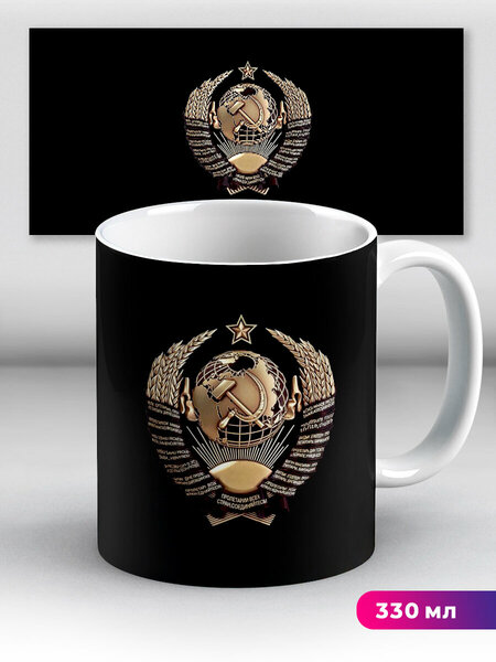 Кружка Герб СССР Советского союза золотой на черном. Оригинальный яркий принт станет отличным подарком на день рождения, 23 февраля, Новый год, день всех влюбленных, лучшей подруге, моей ЛП, сыну, дочери, мальчику, девочке, папе, маме, любимой, любимому, мужу, жене, брату, сестре, другу, мужчине, женщине, парню, девушке, коллеге, сотруднику на работе, начальнику, а также станут незаменимым предметом обихода дома или просто сувениром. Кружка с приколом для чая и кофе сделана из керамики, её можно использовать в микроволновой печи. Купите нашу крутую кружку, и вам не понадобится термокружка, пластиковая бутылка для воды, пивная кружка с надписью, бокал для пива с двойными стенками и стакан с двойным дном. Мы стараемся тщательно упаковывать наши яркие кружки в пузырчатую пленку и картонные коробки, но все равно рекомендуем обязательно проверять хрупкие товары при получении.