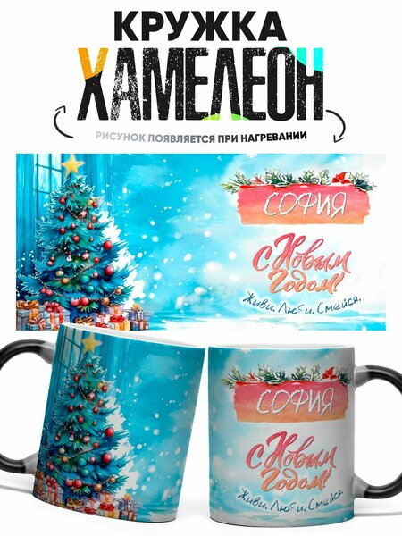 Подарите зимнее волшебство с именной кружкой-хамелеоном "с новым годом софия"! при нагревании кружка меняет цвет, раскрывая праздничный дизайн и нежное поздравление. эффект хамелеона создаёт настоящую магию, делая каждое чаепитие особенным и вдохновляющим. подарок, который согреет сердце и создаст атмосферу праздника!