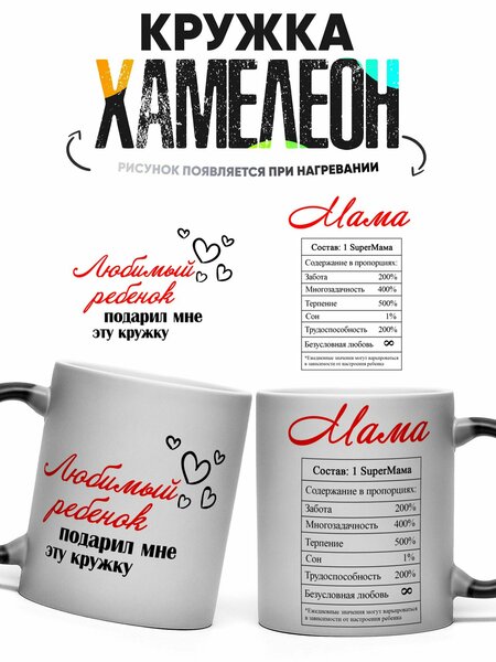 Кружка-хамелеон "Состав супер мама" объемом 330 мл станет идеальным подарком для настоящей героини семьи. При нагревании меняет цвет, раскрывая яркий и вдохновляющий принт, который подчеркнёт уникальность и силу мамы. Высококачественный материал сохраняет тепло и радует эффектом трансформации каждый раз, когда наливаешь горячий напиток.