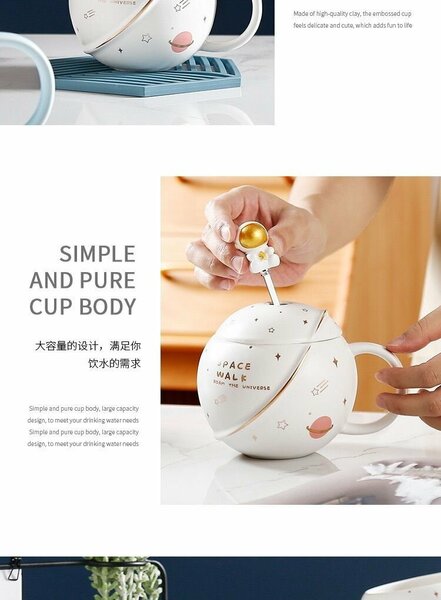 Стиль дизайна На тему «Космическое путешествие», корпус чашки имеет сферическую форму, украшен звездами, планетами и другими элементами; на крышке установлен объемный фигурный астронавт. В целом стиль выглядит мило и обладает научно-фантастическим ощущением. Подходит для повседневного питья воды или кофе, а также благодаря высокой эстетике и креативному дизайну часто используется в качестве подарка (например, для пар или в качестве сувенира). Хотите, чтобы я подготовил для вас список ключевых моментов при выборе таких чашек?
