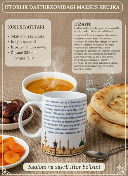 Специальная тематическая кружка, созданная для священного месяца Рамадан. На поверхности кружки нанесена молитва (дуа) для ифтара, что делает её не просто посудой, а духовным напоминанием во время разговения. Дизайн выполнен в тёплых жёлто-золотых оттенках с изображениями луны, звёзд и фонарей, символизирующих атмосферу Рамадана. Качественная печать обеспечивает чёткость текста и стойкость рисунка. Объём: 330 мл Материал: высококачественная керамика Ручка: удобная и прочная Печать: устойчива к выцветанию и мытью Подходит для: чая, кофе, какао и других горячих напитков Уход: рекомендуется ручная мойка для сохранения рисунка Отличный вариант подаркаИдеально подходит в качестве подарка для родных, друзей, коллег и близких в месяц Рамадан. Создаёт особую духовную атмосферу во время ифтара и каждый раз напоминает о молитве.
