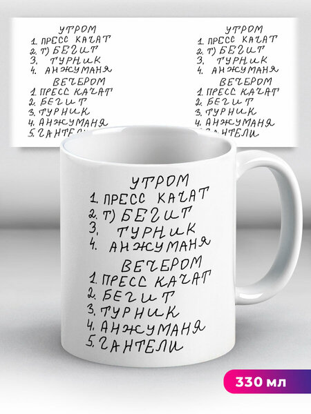 Кружка с приколом Мем Утром Пресс качат Бегит Бежать Турник Анжуманя Анжумания Отжимания Вечером Гантели ЗОЖ Спорт Шрек Я хочу какать Лицо Вор какашек Бегите я чинчопа, сидит в очках Отлично Пофиг, Очень хочу хочю, Скорей домой, Письколом поросенок Майнкрафт. Оригинальный яркий принт станет отличным подарком на день рождения, Новый год, день всех влюбленных, 23 февраля, 8 марта, лучшей подруге, моей ЛП, сыну, дочери, мальчику, девочке, папе, маме, любимой, любимому, мужу, жене, брату, сестре, другу, мужчине, женщине, парню, девушке, коллеге, сотруднику на работе, начальнику, а также станут незаменимым предметом обихода дома или просто сувениром. Кружка с приколом для чая и кофе сделана из керамики, её можно использовать в микроволновой печи. Купите нашу крутую кружку, и вам не понадобится термокружка, пластиковая бутылка для воды, чайный сервиз, походная пивная кружка с надписью, бокал для пива с двойными стенками и стакан с двойным дном. Мы стараемся тщательно упаковывать наши яркие кружки в пузырчатую пленку и картонные коробки, но все равно рекомендуем обязательно проверять хрупкие товары при получении.