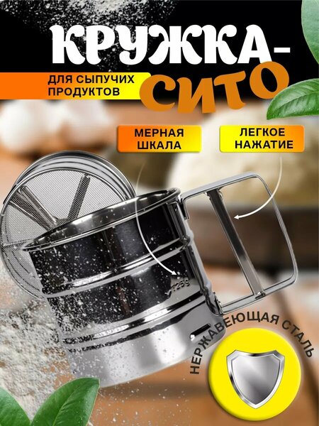 Кружка-сито для просеивания муки, крупы, манки и других сыпучих продуктов - аксессуар нового поколения! Теперь просеивать муку перед приготовлением кулинарных шедевров стало еще удобней, так как появилась удобная ручка с пружинным механизмом, который вращает лопасти внутри кружки-сита. В отличие от традиционного сита, кружку не нужно трясти и мука не будет рассыпаться по всей кухни. Механизм вращает лопасти и, при повторяющихся нажатиях на ручку, мука аккуратно просеивается, а лопасти разбивают образовавшиеся комочки. Кружка выполнена из прочной нержавеющей стали, компактная и удобная в хранении.