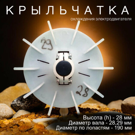 Крыльчатка подходит на вал 28мм/29мм, вал 190мм: высококачественный компонент для электродвигателей Крыльчатка 28мм/29мм, 190мм - это высококачественный компонент для электродвигателей, произведенный в Китае. Она обеспечивает оптимальную производительность и эффективность работы электродвигателя, благодаря диаметру посадки вала 28мм и 29мм. Диаметр крыльчатки по лопастям 190мм, что позволяет устанавливать ее на различные типы электродвигателей. Крыльчатка изготовлена из прочных и долговечных материалов, что гарантирует ее надежность и долгий срок службы. Использование крыльчатки 28мм/29мм, 190мм в электродвигателе позволяет улучшить его производительность, снизить энергопотребление и увеличить срок службы. В целом, крыльчатка 28мм/29мм, 190мм является отличным выбором для тех, кто ищет надежный и качественный компонент для своего электродвигателя.