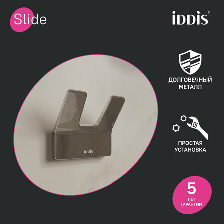 Крючок Slide выполнен из прочного сплава металлов, что гарантирует долгий срок эксплуатации аксессуара. Сияющее хромированное покрытие защищает изделие от коррозии. В комплекте удобный и надежный крепеж, изделия просты в установке, монтаж не требует профессиональных навыков и знаний. • Аксессуары IDDIS® прослужат дольше во влажном помещении ванной комнаты благодаря прочному и стойкому к коррозии материалу. • Крепежные элементы скрыты корпусом, что обеспечивает привлекательный и аккуратный внешний вид аксессуаров. • Мы даем гарантию на аксессуары IDDIS® 5 лет, чтобы вы были уверены в надежности и высоком качестве нашей продукции.