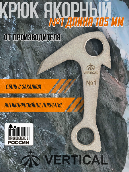 Якорные крючья предназначены для точек страховки на скальном рельефе. Крюк стальной якорный может применяться в альпинизме, горном туризме, при восхождениях в спелеотуризме. Изготовлены из закаленной стали и имеют антикоррозионное покрытие. Наибольшие нагрузки выдерживает якорный крюк, установленный в вертикальную трещину, забитый полностью, до верхнего отверстия. Ножка якорного крюка должна упираться в скалу. В этом случае минимальная разрушающая нагрузка составляет 18 кН. Но, благодаря своей геометрии, крюк может использоваться и с неполностью забитым клювом, тогда под воздействием нагрузки он будет стремиться войти глубже. Установка крюка в горизонтальные и наклонные трещины возможна только для "прохождения" с помощью ИТО, не для страховки! Якорный крюк незаменимый аксессуар, который дополнит альпинистское снаряжение и снаряжение для скалолазания. Длина используемого якорного крюка определяется глубиной щели. Длина якорного крюка - 105 мм. Длина клюва - 42 мм. Масса 51 г. Минимальная разрушающая нагрузка - 18 кН