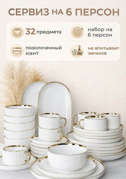 Миска — 6 шт. Чашка — 6 шт. Тарелка — 6 шт. Тарелка средняя (8) — 6 шт. Тарелка большая (10) — 6 шт. Овальная тарелка — 2 шт. ✨ Отличный выбор для семьи, приёма гостей и праздничного стола. Оптимальное соотношение цены и качества.