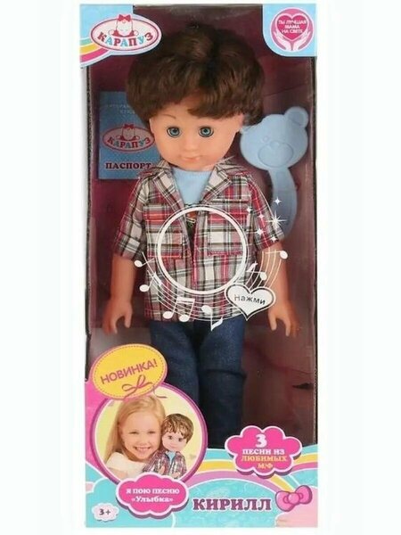 Интерактивная кукла Кирилл представляет собой озвученную игрушку, которая поёт 3 песни из любимых мультфильмов. Нажмите кнопку на груди куколки и услышите песенки. Рост 35 см. Материал: пластмасса + текстиль. Работает от 3 батареек LR44 типа (входят в комплект). На Кирилле модный костюм и туфельки. Одежду и обувь легко снять и надеть. Очаровательное личико куколки детально проработано и вызовет у ребёнка самые трепетные чувства. Шелковистые волосы легко расчёсывать и экспериментировать с укладками. Рекомендовано детям от 3 лет.