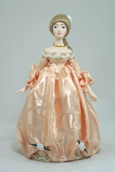 Кукла Потешного промысла Фрейлина. 18 век. Материал фарфор, текстиль. Высота 26 см. Артикул 0942. В наличии в персиковом платье, с белыми волосами и веером.