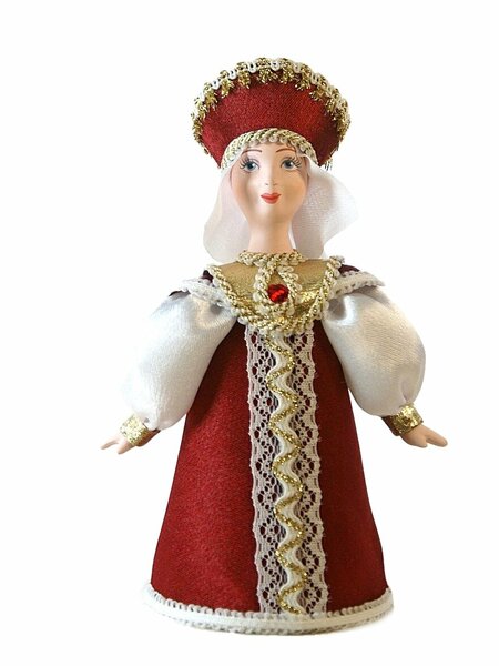 Кукла Потешного промысла в русском женском праздничном костюме. Княгиня. Фарфор, текстиль. Высота 17 см. Артикул 0108. Сделана в Санкт-Петербурге мастерами предприятия народных художественных промыслов «Потешный промысел». Ручная работа. Голова и руки из бисквитного фарфора, отлиты и обожжены в собственной керамической мастерской при температуре +1200 градусов Цельсия. Расписаны вручную темперными красками. В основании конус из папье-маше (картон, ПВА, хлопчатобумажная ткань). Костюм несъемный текстильный. Ног у данной модели не предусмотрено. Поставляется в крафтовой транспортировочной коробке с фирменным логотипом, пакете и пузырчатой плёнке. Мы стараемся поддерживать актуальность изображений, однако это кукла ручной работы, поэтому конкретные экземпляры одной модели и одного выпуска не похожи друг на друга как близнецы, но могут отличаться в мелких деталях. Куклы одной модели разных выпусков могут также отличаться деталями, цветом одежды и росписью лица. Рекомендуем хранить и эксплуатировать в сухом помещении при температуре не ниже +16 градусов, не подвергать воздействию прямых солнечных лучей, воды и огня.