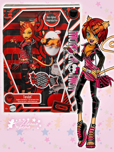 Оригинальные куклы Monster High возвращаются, и они такие же жутко-прекрасные, как и в первый день школы. Торалей, как всегда, выглядит просто потрясающе в своём оригинальном наряде: блузке в тигровую полоску, куртке из искусственной кожи и капри с когтями. Шикарная стрижка боб подчеркивает её шейный платок, а перчатки без пальцев, ремень и туфли на каблуках с ремешками и заклёпками добавляют изюминку её кошачьему образу. В комплекте с куклой идут жутко стильные и сказочные предметы: сумочка, дневник, расчёска и, конечно же, её любимец всех малышек Сладкие Клыки. Кукла Торалей подвижна в локтях, запястьях и коленях — поместите её на идущую в комплекте подставку для игр и демонстрации.