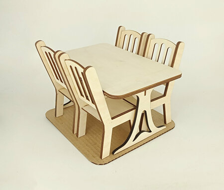 В состав набора входит стол и 4 стула. Такой набор можно поставить в кукольный домик. Или использовать отдельно для организации кукольного чаепития. Размеры: - стол: 11,5х7,5х6 см, - стул: 8х5х4,5 см. Материал: березовая фанера 5 мм, покрытая лаком Упаковка: прозрачный пакет