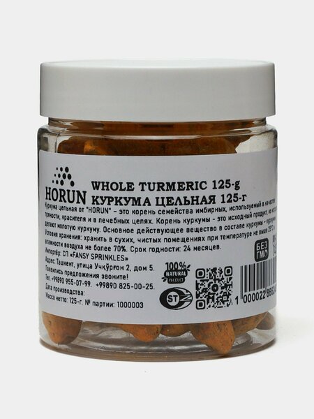 Куркума цельная от "HORUN" 125 г - это натуральная оранжевая индийская куркума, выращенная в Индии и других странах Южной Азии. Произведена на предприятии полного цикла в Индии. Куркума широко используется в кулинарии для придания блюдам характерного пряного вкуса и яркого оранжевого цвета. Она также используется в традиционной медицине как противовоспалительное, противомикробное и противоопухолевое средство. Натуральная оранжевая куркума также используется в качестве диетической добавки для поддержания здоровья и укрепления иммунитета. Куркумин является одним из наиболее активных компонентов куркумы и отвечает за многие полезные свойства этой пряности. Кроме того, куркума является богатым источником антиоксидантов, витаминов и минералов. Помимо куркумина, куркума содержит эфирное масло, в составе которого присутствуют бисаболол, цинеол, турмерон; камфен, сабинен и другие активные вещества, усиливающие полезные свойства куркумы. Куркума от "HORUN" содержит множество витаминов и минералов, таких как витамин С, Е, калий, железо, марганец и другие. Энергетическая ценность в 100 г составляет 0,1 ккал, жиры - 0,0 г, белки - 0,0 г, углеводы - 0,0 г. Упаковка: пластиковая банка. Вид специи/пряности: куркума. Вес: 125 г. Объем: 200 мл.