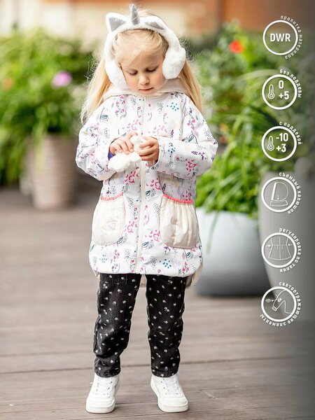 Удлиненная куртка-парка Жизель для девочки с нежным цветочным принтом и сочетанием двух видов тканей: мембрана и металлизированная курточная. Спереди накладные карманы, утяжка по талии. Удлиненная спинка защитит от задувания ветра, а светоотражающие элементы сделают ребенка заметным на дороге в темное время суток.