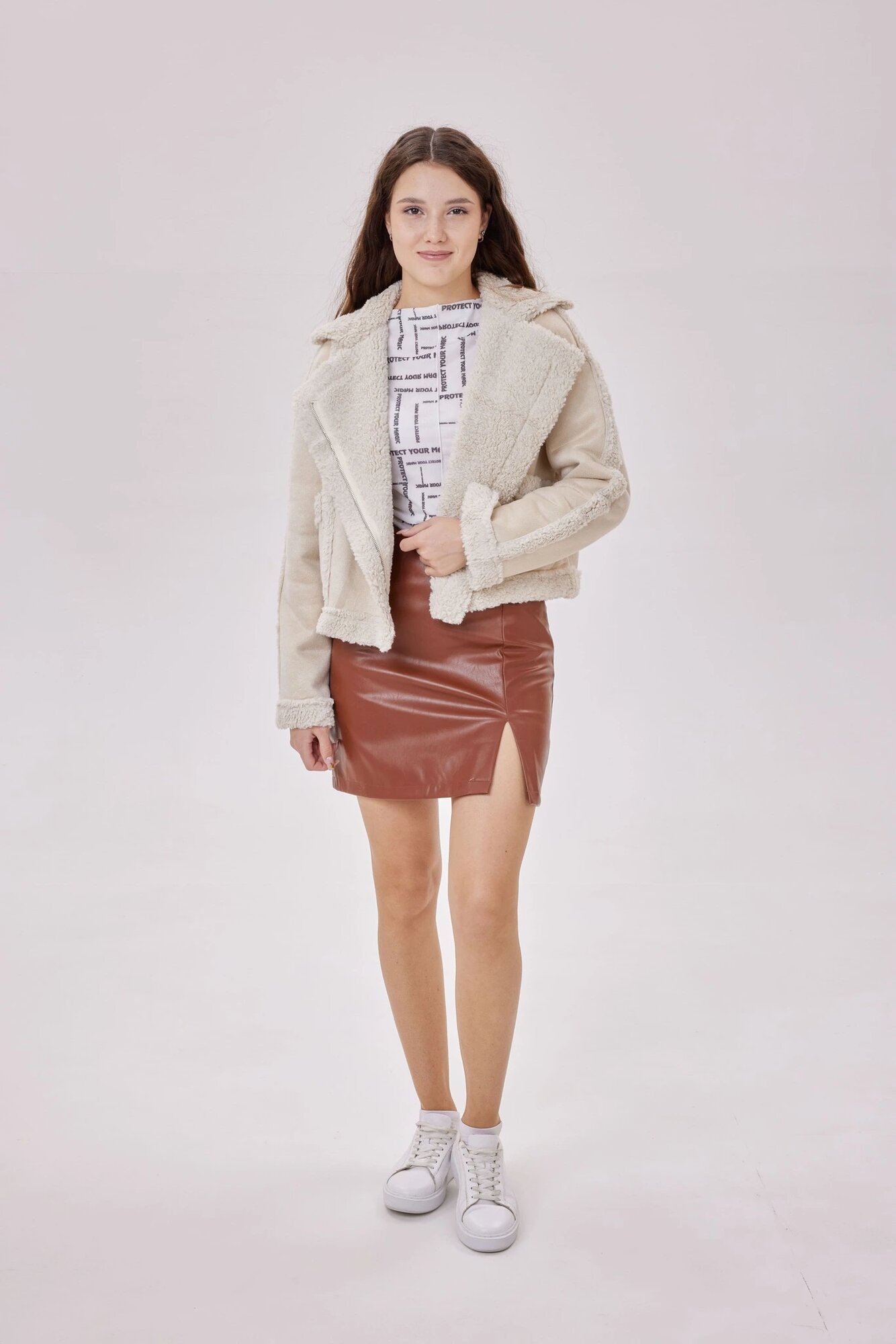 Стильная укороченная куртка со спущенной линией плеча, объемным отложным воротником и застежкой на молнию. Теплая и комфортная модель, выполненная из замши, станет идеальным вариантом для повседневных образов в прохладную погоду.