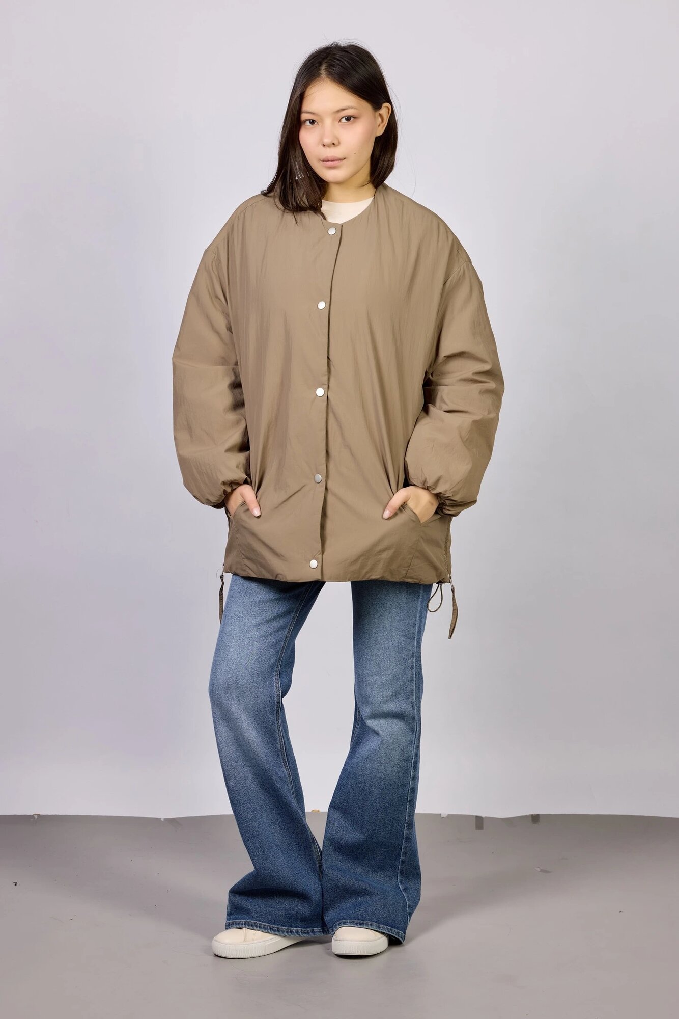 Минималистичная оверсайз куртка без воротника с застежкой на клепки. Модель, которая отлично впишется в спортивный или повседневный образ.