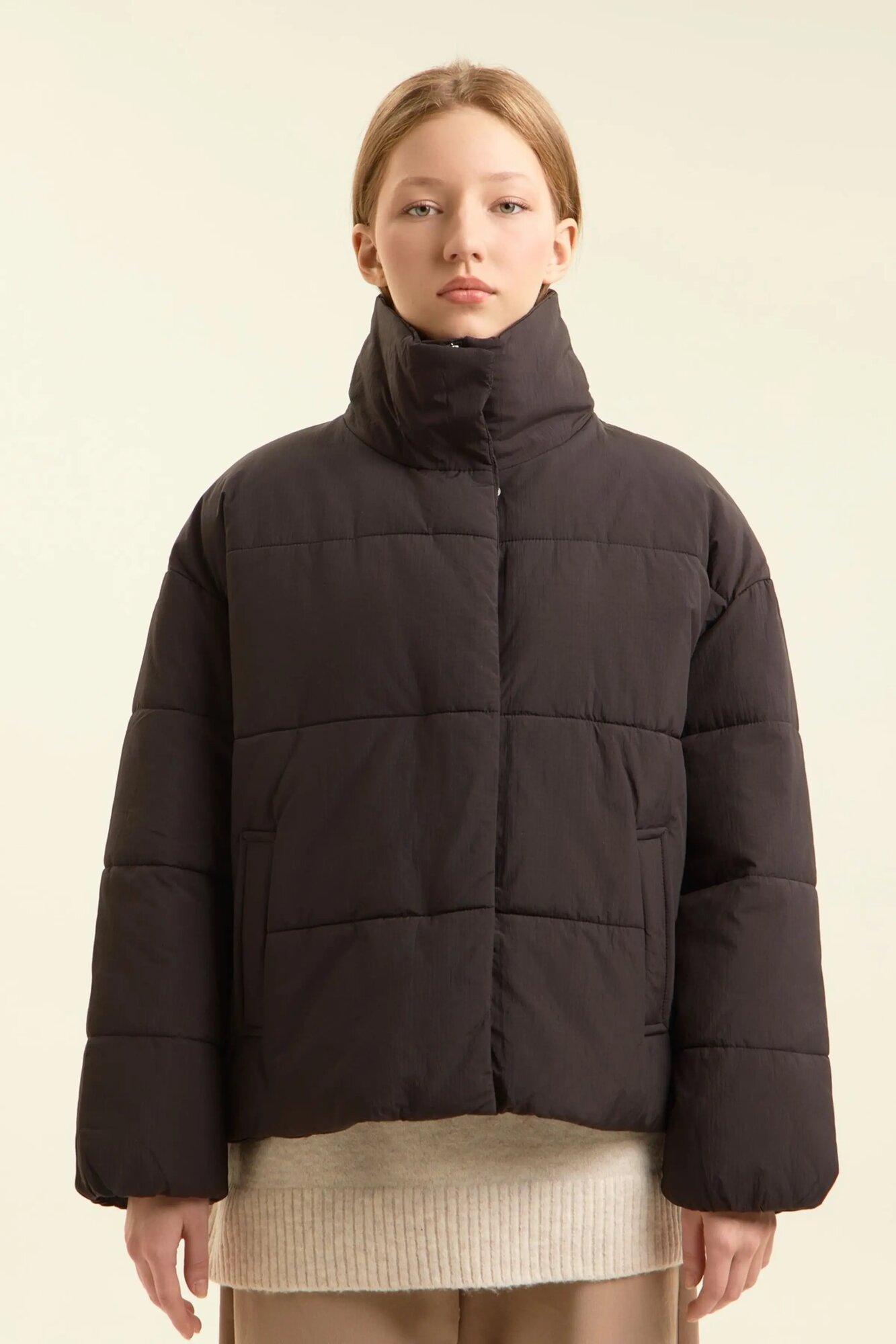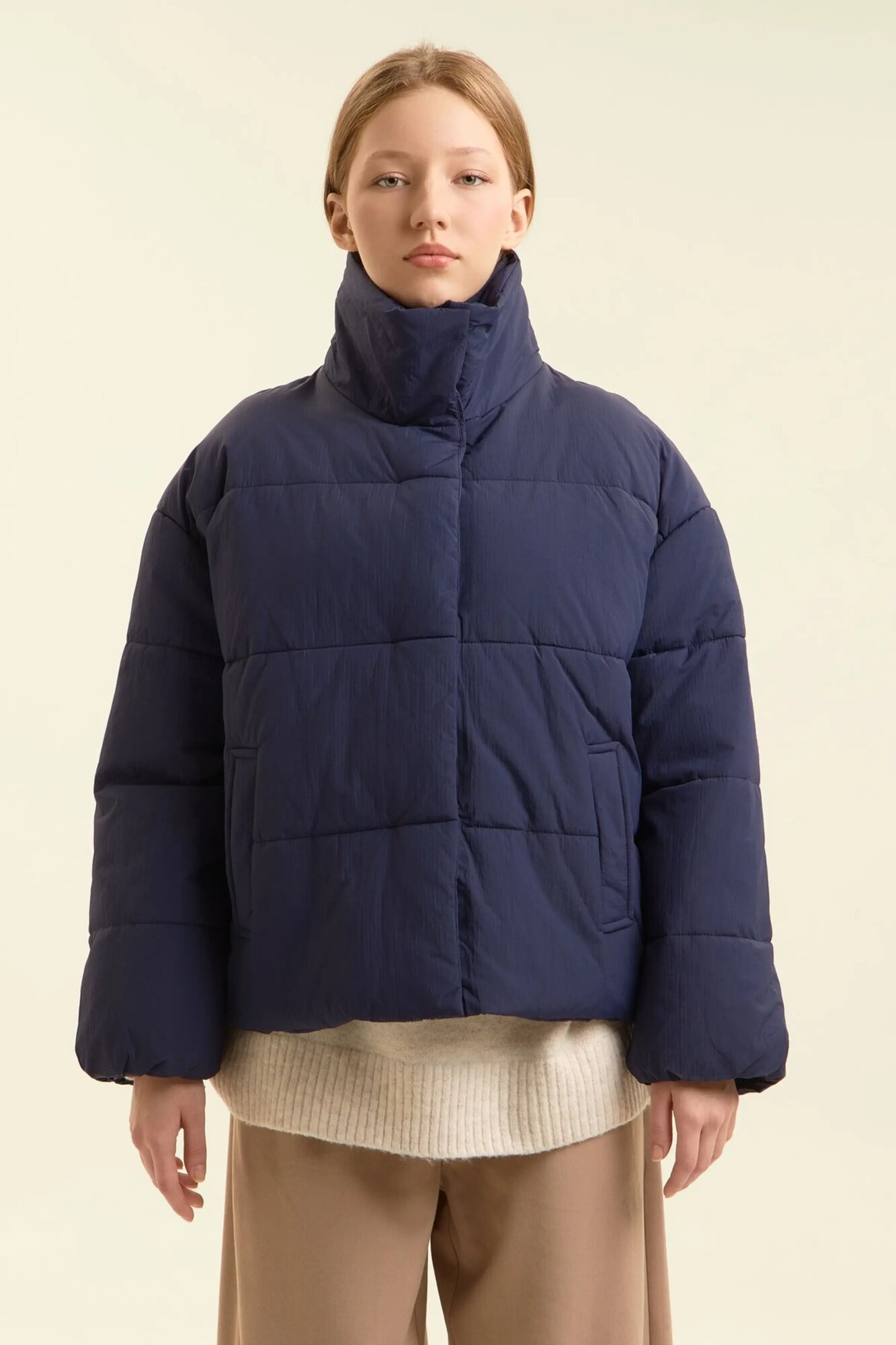 Утеплённая куртка прямого силуэта с высоким воротником-стойкой создаёт комфортный и защищённый образ для холодного сезона. Лаконичная форма подчёркивает аккуратные линии и делает вещь универсальной для городских сочетаний — от базовых джемперов до объёмных свитеров. Продуманная длина и мягкая структура обеспечивают свободу движений, позволяя сохранять тепло без утяжеления. Модель дополнена горизонтальной стёжкой, поддерживающей ровное распределение объёма, а также скрытой застёжкой, которая делает внешний вид более аккуратным и чистым. Куртка легко комбинируется с широкими брюками, денимом или трикотажными низами, позволяя формировать практичные и удобные образы на каждый день.