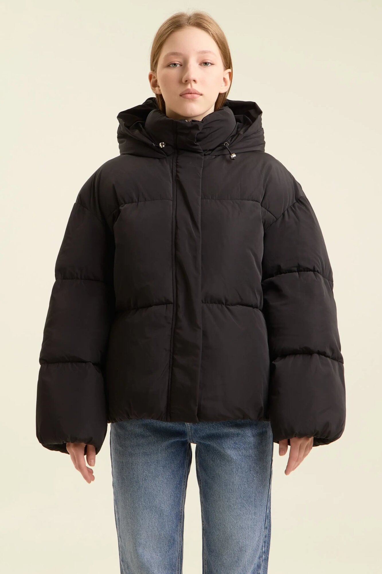 Тёплая куртка с мягким объёмным силуэтом создаёт спокойный и уютный образ, подчёркивая аккуратность линий и обеспечивая комфорт в холодное время года. Укороченная длина делает модель удобной для активного ритма дня, а высокий воротник и капюшон надёжно защищают от ветра. Свободный крой позволяет легко сочетать куртку с трикотажными платьями, джоггерами или повседневными брюками. Эластичные манжеты помогают сохранять тепло, а гладкая поверхность ткани придаёт изделию современный и аккуратный вид. Такая модель гармонично вписывается в базовый зимний гардероб.