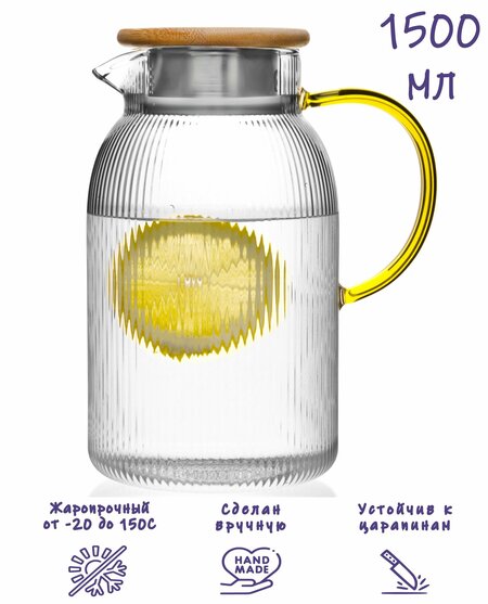 Удобный функциональный кувшин стеклянный для холодных и горячих напитков, объемом 1,5 литра. Корпус чайника-кувшина сделан из термостойкого боросиликатного стекла, которое выдерживает температуру от -20С до +150С. Графин стеклянный для воды можно использовать, как для горячих напитков (чай, глинтвейн), даже в качестве чайника, который можно ставить на плиту, так и для холодных напитков (лимонад, сок). От перепада температур чайник заварочный стеклянный не треснет и не расколется. Крышка кувшина выполнена из пищевой нержавеющей стали. В верхней части кувшина есть фильтр, выполненный из пищевого силикона, который поможет удержать от попадания в бокал, например, листья мяты из лимонада. Горлышко колбы у кувшина из стекла оптимально для загрузки кубиков льда и нарезанного лимона. Кувшин для воды стеклянный можно мыть в посудомоечной машине - боросиликатное стекло от этого не помутнеет и на нем не появятся царапины. Стеклянный прозрачный кувшин с крышкой продаётся в стильной прочной подарочной упаковке, идеален в подарок на любой праздник: новоселье, 8 марта, новый год, день рождения маме бабушке жене подруге теще.