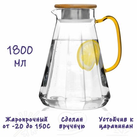 Кувшин из боросиликатного стекла 1800 мл - 1 шт, крышка из стали и бамбука - 1 шт