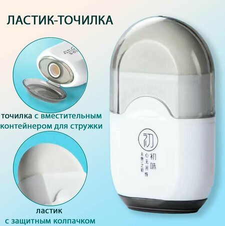 Ластик-точилка 2в1, одно отверстие под карандаш, с ластиком в корпусе, светло-серый