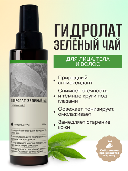 Гидролат - универсальный уход для кожи и волос. Это природный тоник, получаемый в результате дистилляции зеленого чая. Подходит для любого типа кожи. Гидролат зеленого чая обладает мощным омолаживающим свойством, помогает бороться с признаками старения и уменьшает морщины. Спрей эффективен при отеках и воспалениях, улучшает цвет и текстуру кожи. Оказывает антиоксидантный и антивозрастной эффект; тонизирует и увлажняет кожу. Снимает раздражения и выравнивает тон кожи. Стимулирует восстановление клеток кожи. Обладает антицеллюлитным действием, повышает упругость кожи. Подходит для ухода за кожей вокруг глаз. Действие гидролата для волос: укрепляет, способствует росту волос; придает блеск волосам. Подходит для волос любого типа. Безопасен в использовании и подходит для всех типов кожи от сухой до жирной. Не содержит каких-либо вредных добавок, отдушек, консервантов, спирта. 100% натуральный спрей для лица и тела, волос! Лавандовый край - Крымская косметика.
