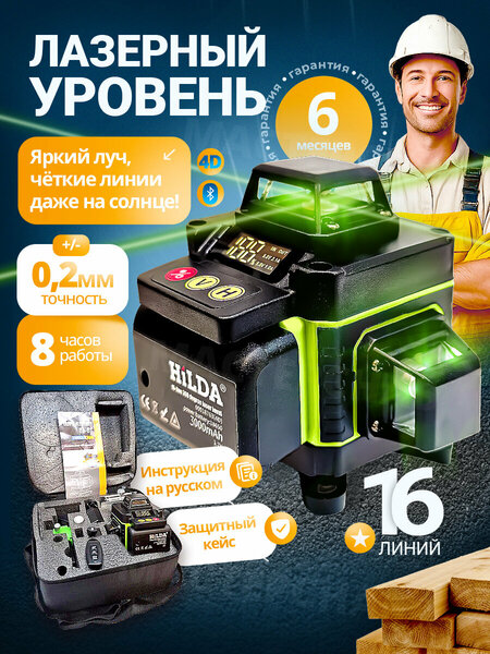 Лазерный уровень 360 HILDA 4D 16 зеленых лучей, с аккумулятором 3000, блютус, пульт.