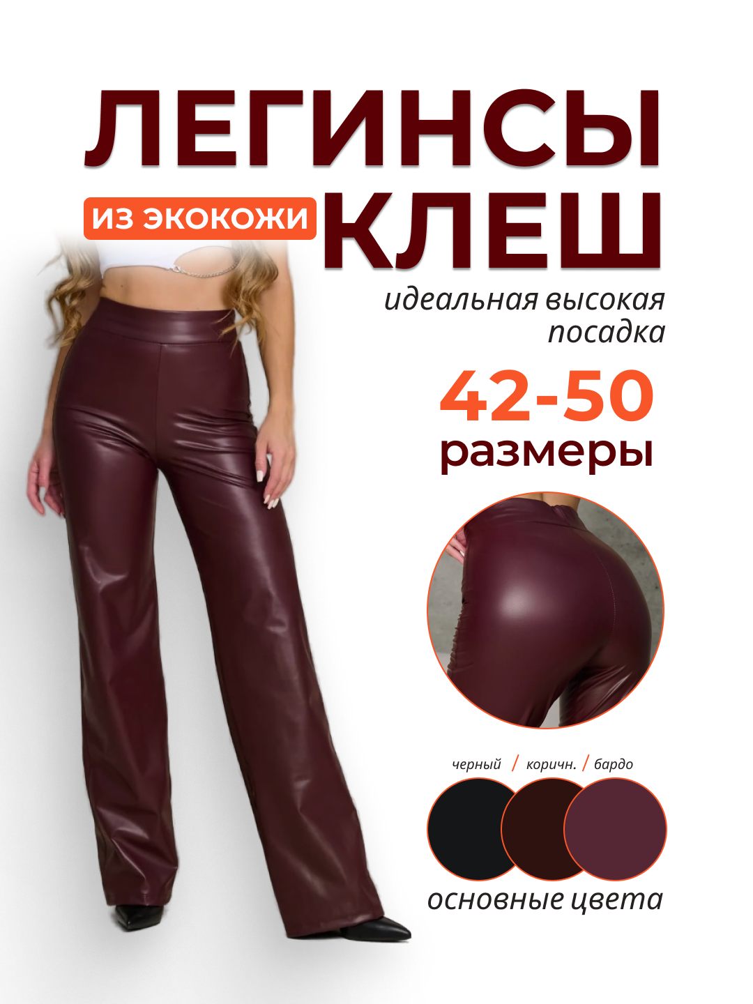 Легинсы-клеш — твоя палочка-выручалочка, чтобы выглядеть эффектно каждый день! Модель, которая мягко подчеркивает фигуру, создавая соблазнительный силуэт и ощущение лёгкой утяжки в области талии. В них сразу чувствуешь себя стройнее и увереннее. Брюки-легинсы имеют эталонную посадку: высокая талия и эластичный широкий пояс на резинке без пуговиц или молнии. Плотная отлично тянущаяся ткань эко кожа комфортная при носке, мягко моделирует тело, не стесняет движений, не растягивается и не теряет формы. Брюки клеш универсальны на все случаи жизни. Создавай образы для офиса, учёбы, прогулок или вечеринки! Они бесподобно смотрятся как с кедами и кроссовками, так и с элегантными лодочками. Благодаря плотной искусственной ткани, в них комфортно даже при температуре до -5°C. Важный момент: при распаковке возможен легкий запах, характерный для эко-кожи после хранения в упаковке. Не переживай! Он бесследно исчезнет после первой же носки или стирки. Лосины легинсы подойдут разным типажам фигур и на разный размер – от 42 до 50. На выбор 3 цвета: бардо, коричневый, черный. Порадуй себя обновкой, почувствуй магию комфорта и стиля.