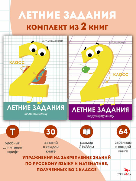 Этот комплект рабочих тетрадей поможет вам организовать процесс летних занятий ребёнка. В тетрадях по 30 занятий, в каждом из них - разнообразные задания на закрепление школьной программы по русскому языку и математике. Ребёнок повторит все типы орфограмм, правила фонетики, основы синтаксиса и пунктуации, поработает со словарными словами, потренируется выполнять разборы слов и предложений. Есть в тетради и творческие задания - например, закончить рассказ, составить ассоциативный ряд, дополнить предложения подходящими словами. Надеемся, что "Летние задания. Русский язык 2 класс" поможет вашему ребёнку закрепить знания, лучше понять логику родного языка и, конечно, полюбить его! С помощью тетради "Летние задания. Математика 2 класс" ваш ребёнок сможет летом повторить школьную программу по математике. В каждом занятии собраны разнообразные задания на закрепление основных тем. Школьник потренируется делать устные и письменные вычисления, определять порядок действий, сравнивать числа, находить значения выражений со скобками; закрепит графические умения и умения решать текстовые задачи; а также усовершенствует свою математическую речь и аналитическое мышление. Надеемся, что эти тетради помогут повысить успеваемость вашего ребёнка.