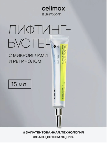 Celimax The Vita-A Retinol Shot Tightening Booster — это новейшая уникальная разработка знаменитого корейского бренда, представляющая собой инновационный бустер с микроиглами для интенсивного антивозрастного ухода за кожей. Бустер представляет собой высоконцентрированное средство ухода, которое усиливает эффект действия других средств, таких как крема и сыворотки. Формула с высокой концентрацией ретиналя и других активных компонентов направлена на активную борьбу с морщинами, улучшение текстуры кожи и повышение её упругости. Бустер легко распределяется и быстро впитывается, не оставляя жирного блеска, и оказывает особенно выраженный эффект в наиболее проблемных зонах, таких как носогубная и межбровная складки, «гусиные лапки», зона расширенных пор и др. Одним из основных активных компонентов в составе бустера являются спикулы (микроиглы) – основы скелета морской губки, обладающие пористой структурой, что позволяет им впитывать в себя питательные вещества и передавать их коже при дальнейшем соприкосновении с ней. Образовывая на поверхности эпидермиса микроскопический прокол, микроиглы проникают глубоко в слои кожи и начинают взаимодействовать с ее клетками, передавая полезные элементы через собственные поры. Микроиглы обладают огромным спектром полезных свойст, самым ценным из которых является высокая способность к стимуляции кровообращения и разглаживанию заломов. Вторым не менее важным компонентом в составе бустера является нано-ретиналь в концентрации 0,1%. Ретиналь отличается от классического ретинола более мягкой и усовершенствованной формулой, особенно эффективной не только в борьбе с морщинами, но и в сужении пор, коррекции акне и особенно глубоком увлажнении. Способствующий также синтезу коллагена и стимуляции обновления клеток, ретиналь помогает значительно сократить количество и видимость морщин и улучшить общую текстуру кожи. Дополняет богатую формулу бустера запатентованный пептид MATRIXYL 3000 в концентрации 3%, обеспечивающий повышение эластичности и упругости кожи. Уже после первых применений бустера заметны значительные улучшения в состоянии кожи - морщины становятся менее заметными, кожа выглядит более упругой и эластичной, а её текстура выравнивается. Для достижения максимального эффекта от применения бустер рекомендуется использовать в комплексе с лифтинг-сывороткой с микроиглами. Приобрести инновационный лифтинг-бустер селимакс с микроиглами и ретинолом Вы можете в магазине оригинальной корейской косметики Lifecosm.